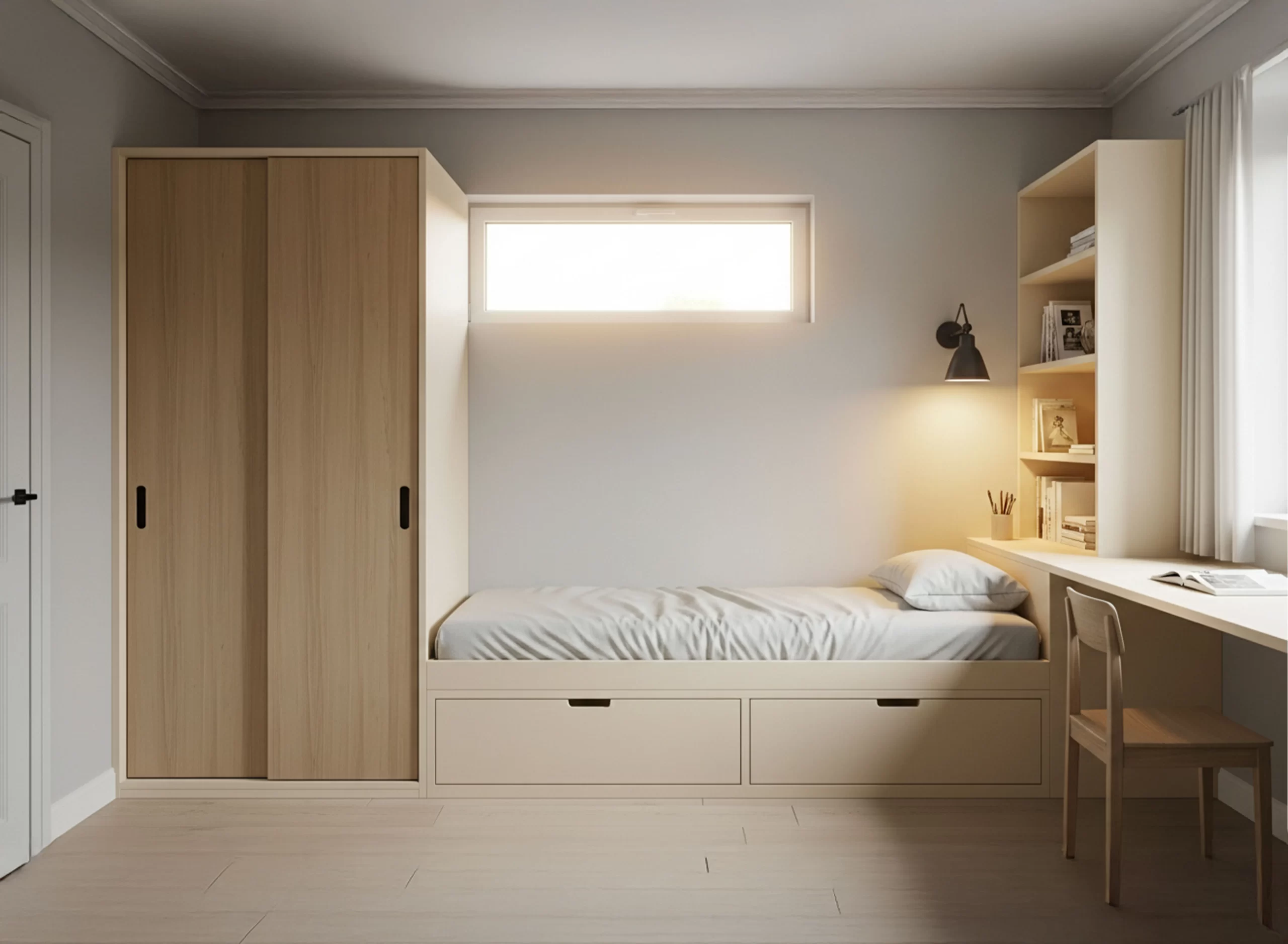 In questo layout, tutti gli elementi principali vengono concentrati su una sola parete: letto, armadio e scrivania si sviluppano in sequenza verticale.
