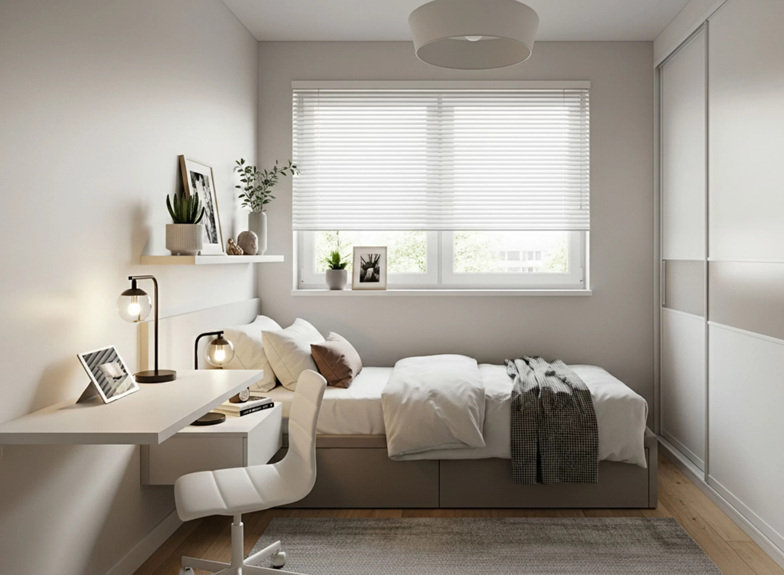 Questa soluzione è ideale quando la stanza è stretta e lunga. Il letto può essere posizionato lungo la parete più lunga, con armadio a tutta altezza accanto e una scrivania compatta verso la finestra. In una camera da letto 6 mq, concentrare gli arredi su un lato consente di mantenere libero il centro stanza, migliorando la percezione dello spazio.