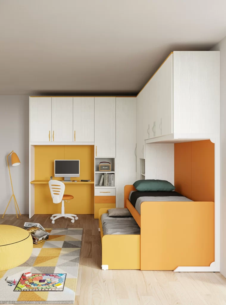 Quando lo spazio รจ davvero minimo, le camerette con letti scorrevoli sono una risposta funzionale ed elegante. I letti si sovrappongono durante il giorno per liberare spazio, e si aprono la sera in pochi gesti. Ottime per chi cerca camerette due letti per ragazzi in ambienti moderni e dinamici.