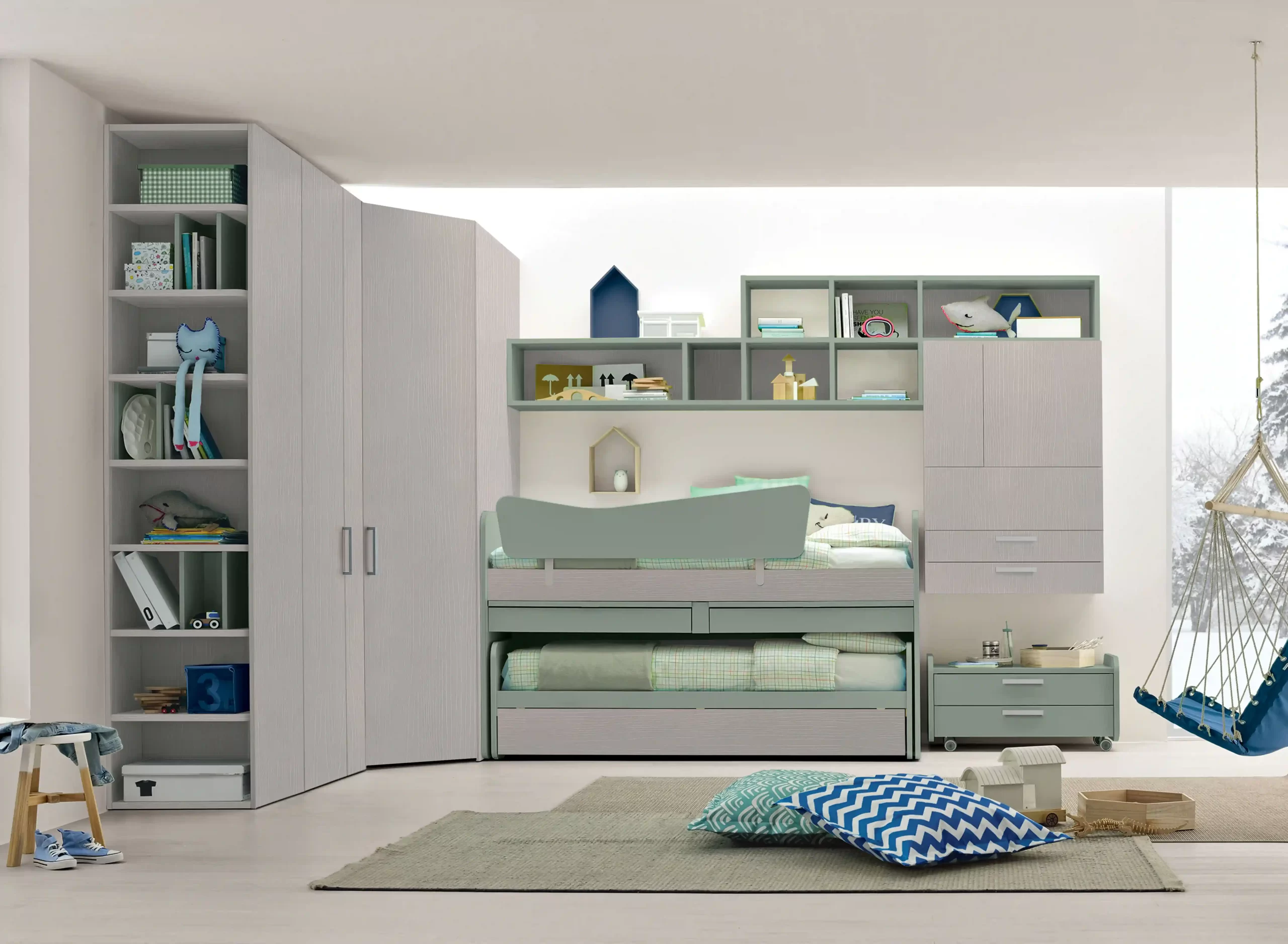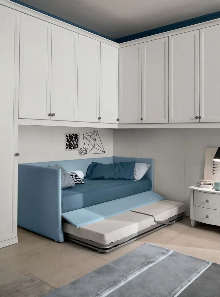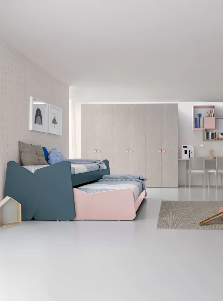 Quando la cameretta è condivisa da fratelli o sorelle, il letto doppio estraibile può essere un alleato prezioso. In molte configurazioni, viene integrato con un terzo letto o con cassettoni contenitori, garantendo massima funzionalità senza rinunciare all’ordine.