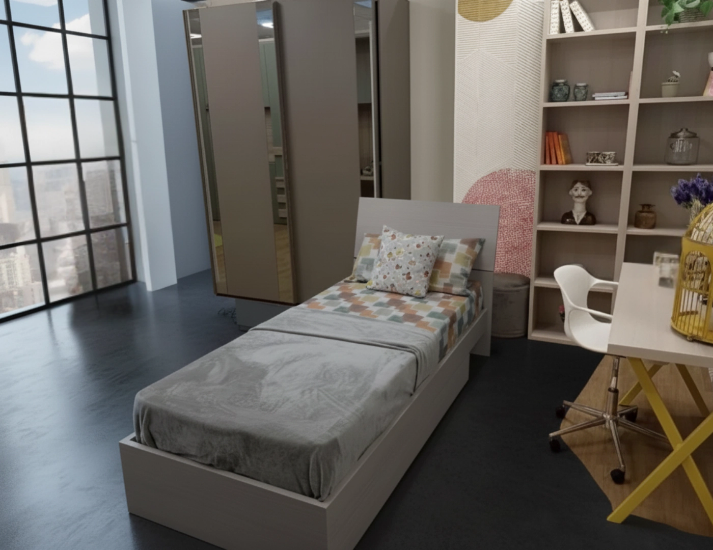 Area notte confortevole:ย Il letto singolo dal design contemporaneo assicura riposo di qualitร , mentre il comodino coordinato offre il giusto spazio per oggetti personali e lampada da lettura.