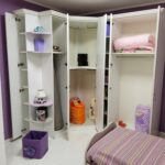 La cameretta presenta un design classico e include un armadio angolare, una scrivania lunga 184 cm, una libreria di dimensioni L.90 x P.33 cm e pensili di L.180 x P.33 cm. Nell’offerta sono compresi anche i due lettini a una piazza e due comodini.