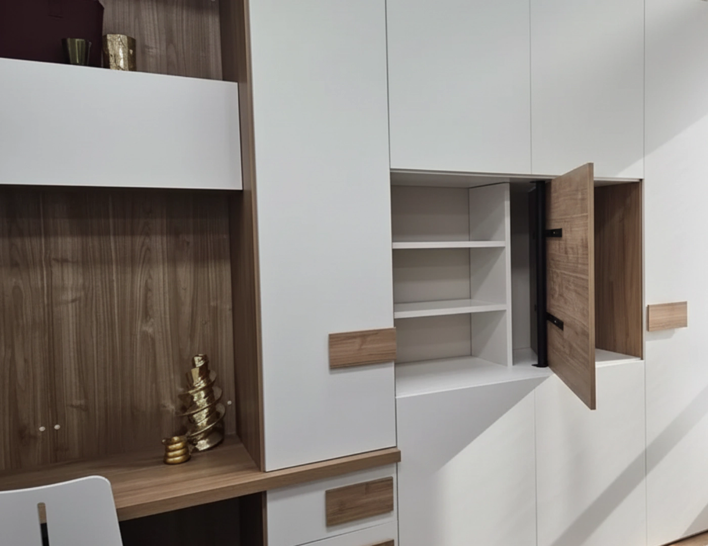 Armadio Battente Angolare di Grande Capacitร  Il cuore della composizione รจ il sistema armadio battente angolare che sfrutta l’angolo della stanza con intelligenza. Le ante battenti garantiscono un accesso completo al contenuto, mentre la struttura modulare offre ripiani, appenderie e vani organizzati per ogni esigenza. La finitura bianco lucido si abbina perfettamente agli inserti in legno naturale, creando un contrasto elegante e moderno.