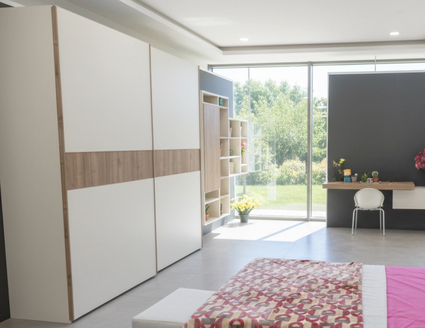 Il cuore della composizione รจ l’armadio a 2 ante scorrevoli da 181cm con elegante inserto a specchio verticale. Le ante scorrevoli ottimizzano lo spazio senza ingombri, mentre lo specchio amplifica la luminositร dell’ambiente, caratteristica fondamentale di ogni cameretta ragazzi moderna.